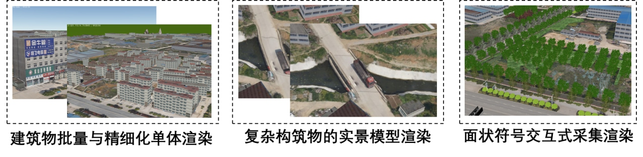运用参数化技术,分层次对要素对象进行描述,能够实现大批量建模。从已有实景三维数据中获取纹理材质,或直接通过便捷化设备直接拍摄补充,以产生与现实世界一致的纹理材质。充分利用现有大量二维测绘生产结果进行全要素单体符号化重构,完成二三维数据参数化建设。